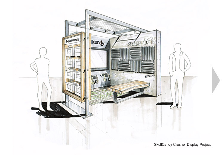 The proposal asked for a small but immersive listening environment, to fully encapsulate the Crusher user for an all-in brand experience. The designers used rough "beetle-aged" veneer, raw concrete, steel, chainlink and cues from the recording/concert industries to make a special brand statement which is at once distinctive but also part of the existing Skullcandy brand feel.
